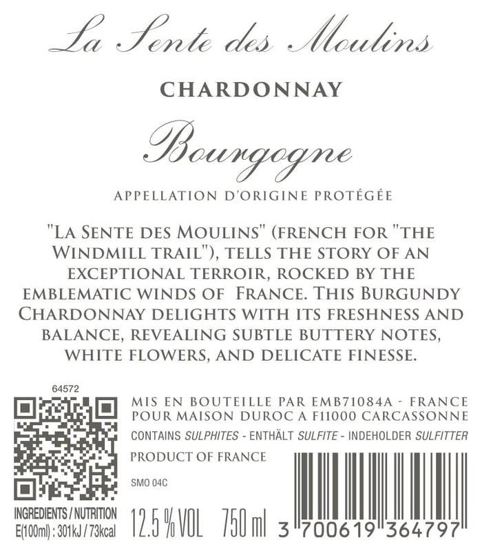 Hemmeligheden bag den toplækre smag i La Sente des Moulin er, at druerne høstes fra forskellige terroirs i bourgogne - lige fra Chablis i nord til Mâconnais i syd – der tilsammen skaber et skønt mix af smagsnuacner. Topkøb!