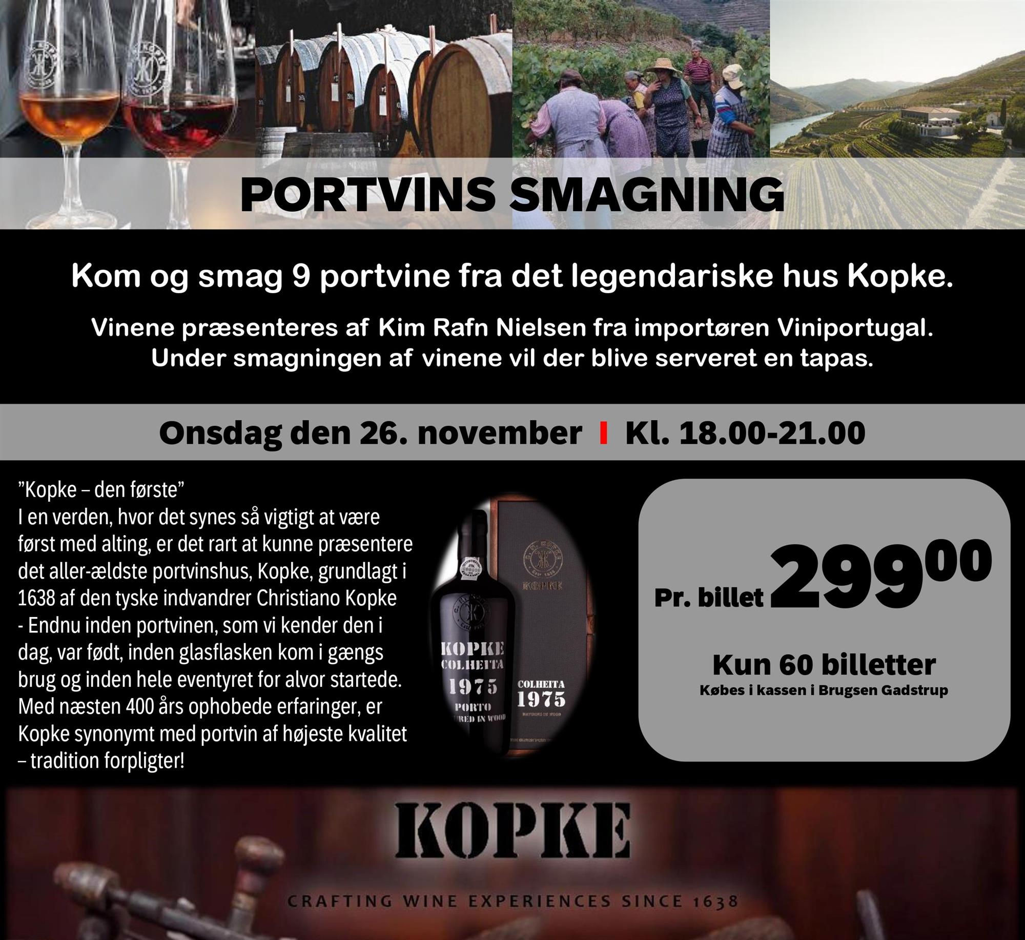 Kom og smag 9 portvine fra det legendariske hus Kopke. Vinene præsenteres af Kim Rafn Nielsen fra importøren Viniportugal. Under smagningen af vinene vil der blive serveret en tapas.