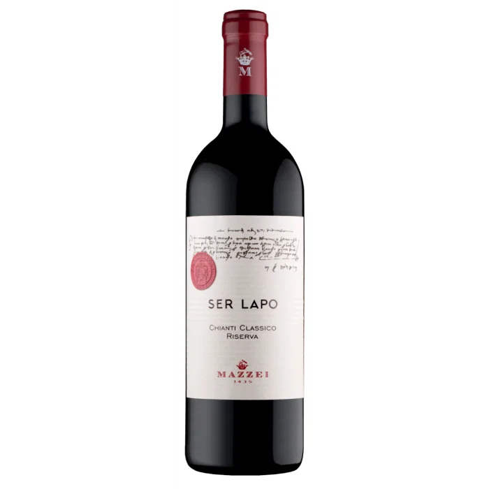 Ser Lapo fra Mazzei er en FANTASTISK lækker fløjlsblød Chianti Classico Riserva, som er lavet på 90% sangiovese og 10% merlot, der giver en lækker rund, fyldig og balanceret vin med det bedste fra begge druetyper! Navnet til vinen er en hyldest til forfaderen Ser Lapo. Druerne er fra Castellina i Chianti og bliver lagret separat i 225 liters franske egetræsfade i 12 måneder i den fantastiske vinkælder under Castello di Funterutoli. Duften og smagen er elegant og intens med toner af modne røde bær.